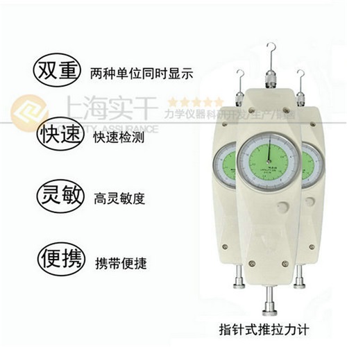 表盤(指針)式拉力計是小型便捷式的拉力、壓力測試儀器,該表盤(指針)式拉力計不僅具有高精度、易操作、可同時顯示牛頓和公斤單位、捷帶方便之優點,而且有一個可作荷重峰值(PEAK)測試及連續荷重值(TRACK)測試切換使用的切換旋鈕(PEAK/TRACK鈕)。
